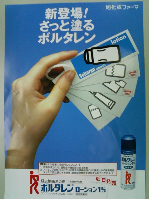 7月28日の記事「ボルタレン外皮用剤ラインナップ」で今後発売予定として「ボルタレンローション1%」「ボルタレンパップ/パップS」「ボルタレンテープL」の3つをご紹介しましたが、そのうちの一つです。