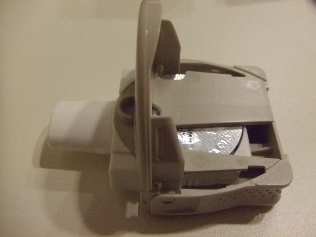 ディスクをセットした状態の吸入器。この状態で吸入をしても、もちろん薬剤を吸い込むことはできません。