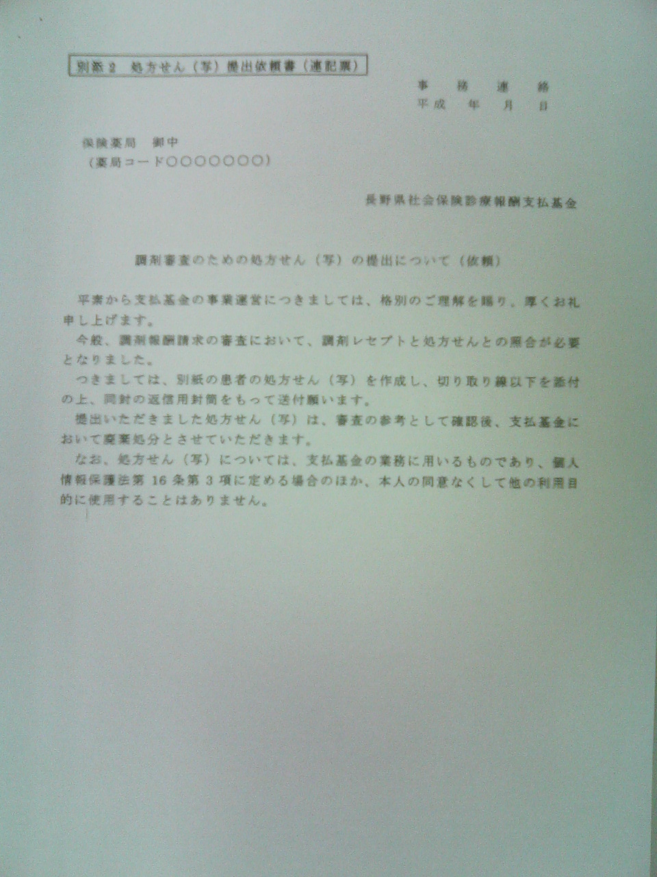 支部薬剤師会より、処方せん(写)提出依頼についての連絡がありました。今年の4月からレセプトに処方せんのコピー添付が不要となりましたが、ここにきて動き出すといった感じでしょうか。