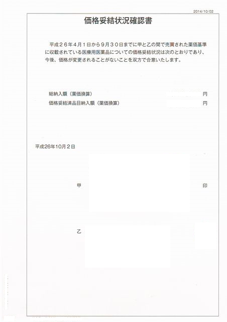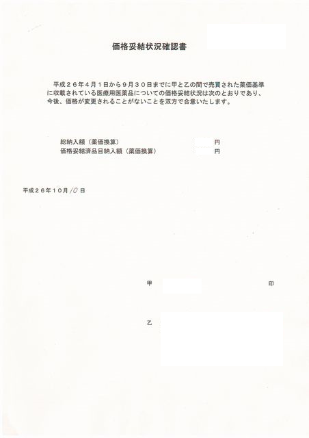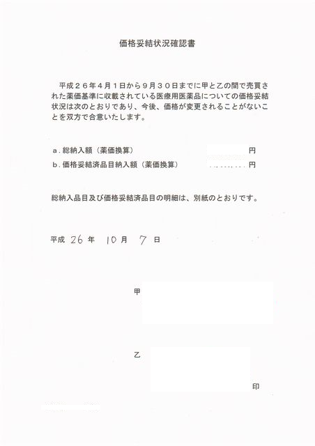 平成26年4月1日から9月30日までに甲と乙の間で売買された薬価基準に収載されている医療用薬品についての価格妥結状況は次のとおりであり、今後、価格が変更されることがないことを双方で合意いたします。
