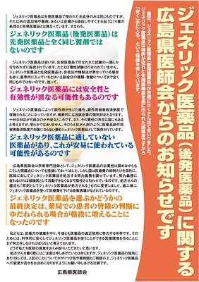 [リンク切れ]広島県医師会:「ジェネリック医薬品(後発医薬品)に関する広島県医師会からのお知らせです」