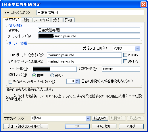 Becky!の設定画面だとこんな感じです。塗りつぶしてあるところ2箇所(メールアドレスの@の前とユーザーID)には日薬のIDを、パスワードにはやはり日薬のパスワードを入れます。