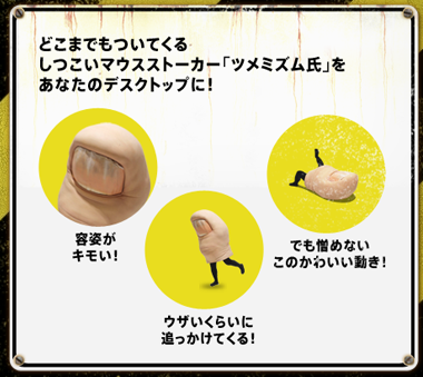 また、キモ・ウザ・かわいいデスクトップストーカー「ツメミズム氏」というキャラクターがいるようです。私もダウンロードしてみましたが、かなり笑えます!一度はダウンロードしてみることをオススメします(笑