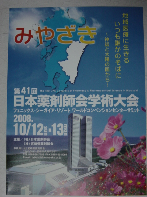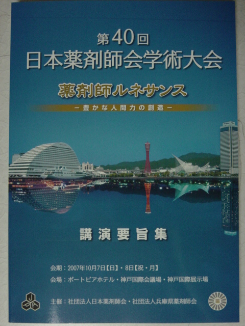 第40回日本薬剤師会学術大会 オモテ X Facebook はてブ LINE Pinterest コピー 2007.09.30 スポンサーリンク 第40回日本薬剤師会学術大会が10月7、8日に神戸で行われますが、その講演要旨集が手元に届きました。 講演要旨集 メインテーマは、 「薬剤師ルネサンス」-豊かな人間力の創造- だということです。 一緒に兵庫の観光案内も入っていました。 おでかけひょうご ちょっと気が早いですが、来年は宮崎だそうです。 2008年開催案内