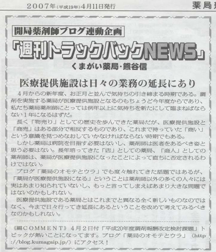 薬局新聞連載の「週刊トラックバックNEWS」の第1回です。紙面にはこんな感じで載っています。