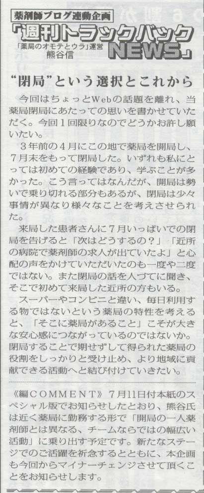 薬局新聞連載の「週刊トラックバックNEWS」第15回です。今回は当薬局の閉局について、紙面をお借りしました。