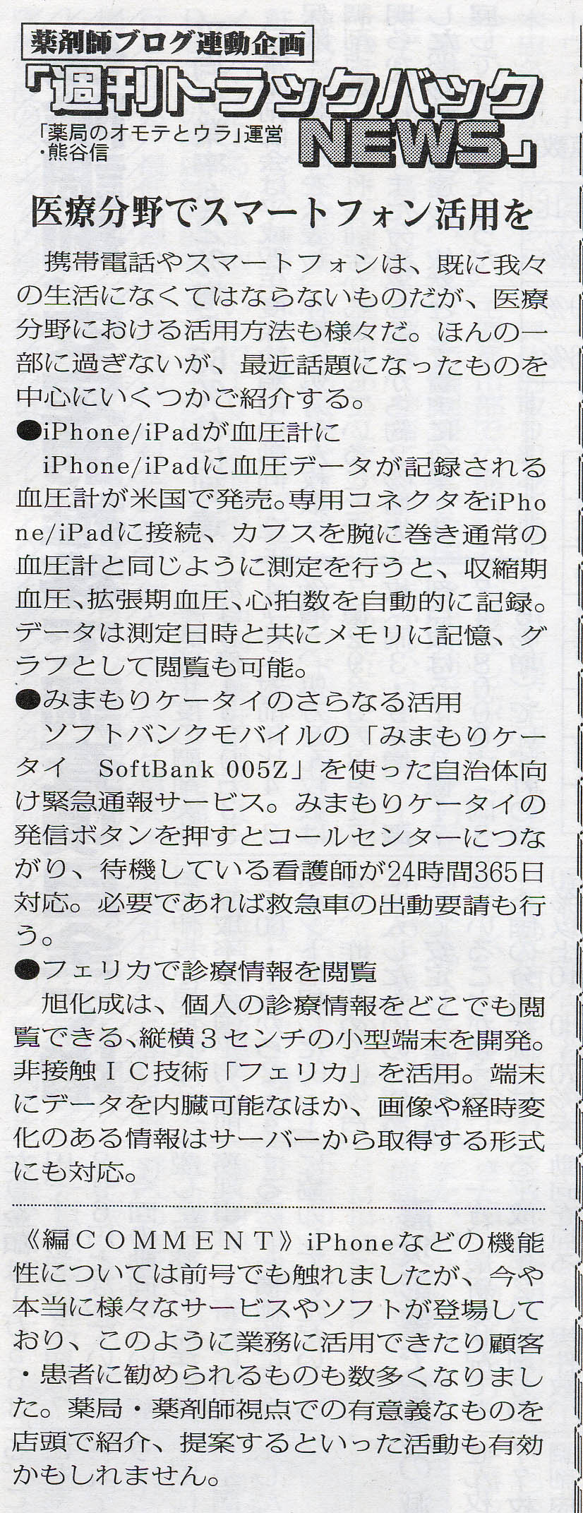 薬局新聞連載の「週刊トラックバックNEWS」第188回です。スマートホンの活用例については、今後ますますいろいろと出てくるでしょうね。