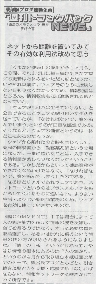 薬局新聞連載の「週刊トラックバックNEWS」第20回です。