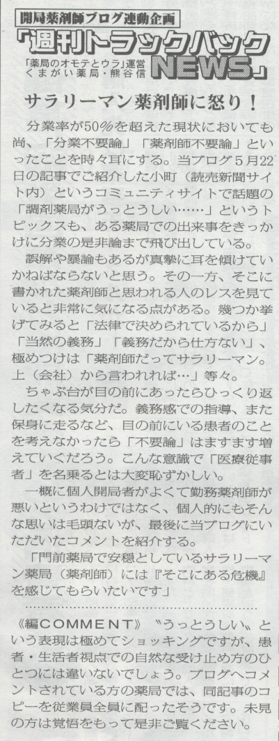 薬局新聞連載の「週刊トラックバックNEWS」の第7回です。小町のトピックスを読んで、また別の角度から考えてみました。