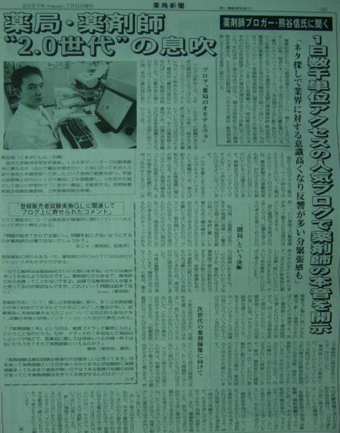 くま様 個人経営の薬局に携わる身である私は、今回のくま様の閉局されるというご決断に、決して他人ごとではないという気持ちを強くもちました。 新たな挑戦の成功を祈念いたします。 さて、私のコメントも紙面に載せて頂けたそうで、大変感謝いたします。 くま様の抜粋には、何ら問題ありません。私の真意そのものです。反響もあったようで、とても有り難く思っています。 あまり、時間がなかったもので、本日、興味深い展開になっているの拝見させていただきました。コメントが遅れましたが、お許しください。