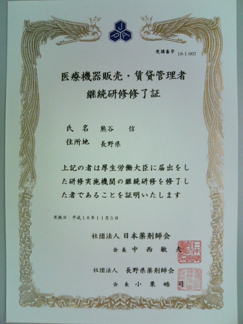 研修を修了すると修了証が交付されます。販売業等の届出・許可更新の際には、継続研修の有無についてチェックが入るようです。