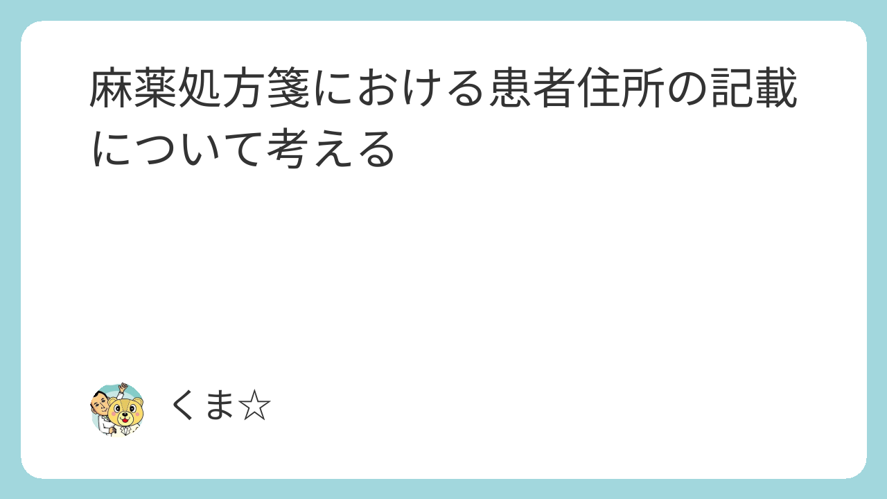 現状、大きな事故が起こっていないので、麻薬処方箋の患者住所欄には「とりあえずそれらしい住所が入っている」として、厳密にチェックしなくてもトラブルにはなっていませんが、本当にそこに居住の実態があるのか、その辺りの照合という話が、今後出てこないとも限りませんね。