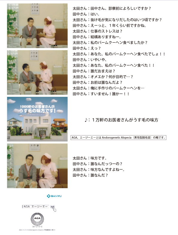 一部地域では既に放送されているようですが、爆笑問題を起用したAGAの新CM –「AGA問診」篇– が1月12日より全国オンエアされるということです。