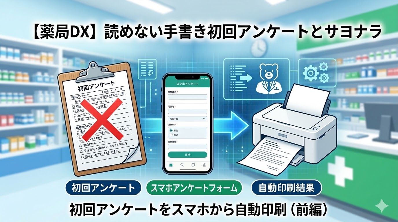 そこで今回、この初回アンケートを患者さん自身のスマートフォンで入力してもらい、さらにその内容を薬局内のプリンターで自動印刷する仕組みを作ってみました。