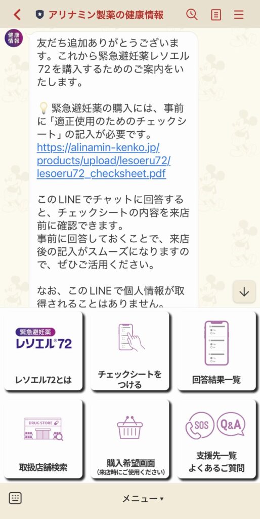 購入時: LINE(トークルーム)で事前に「チェックシート」を入力でき、薬局では「購入希望画面」をスマホで見せる使い方が可能。「アフターピルをください」と声に出さずにスムーズに受け取れます。