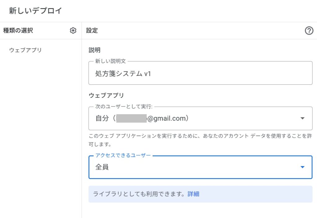 右上の 「デプロイ」 ボタン > 「新しいデプロイ」 をクリック。