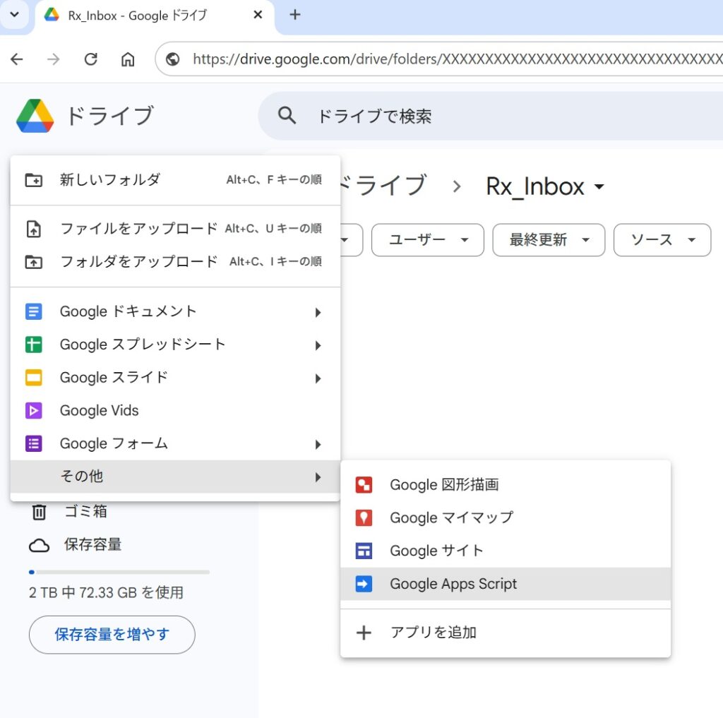 Googleドライブの「新規」ボタン > 「その他」 > 「Google Apps Script」 をクリックします。
